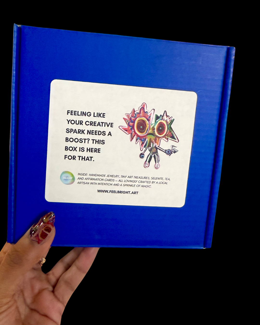 Inside, you’ll find a surprise mix of handmade jewelry, tiny art treasures, selenite, tea, and affirmation cards — all crafted by a local artisan with love, intention, and a sprinkle of chaos. No two boxes are the same. Some even hide a rare Feel Bright pendant… lucky, huh?